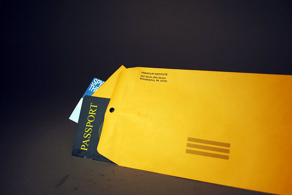 This is an invention series for Spy: The Museum of Espionage. This invention is for investors to give money for the museum. Included is a Passport with info about the event, an airplane ticket with a return slip for the investors donations and their meal, which also has directions to the event. All of this is to give it a "spy" feeling.